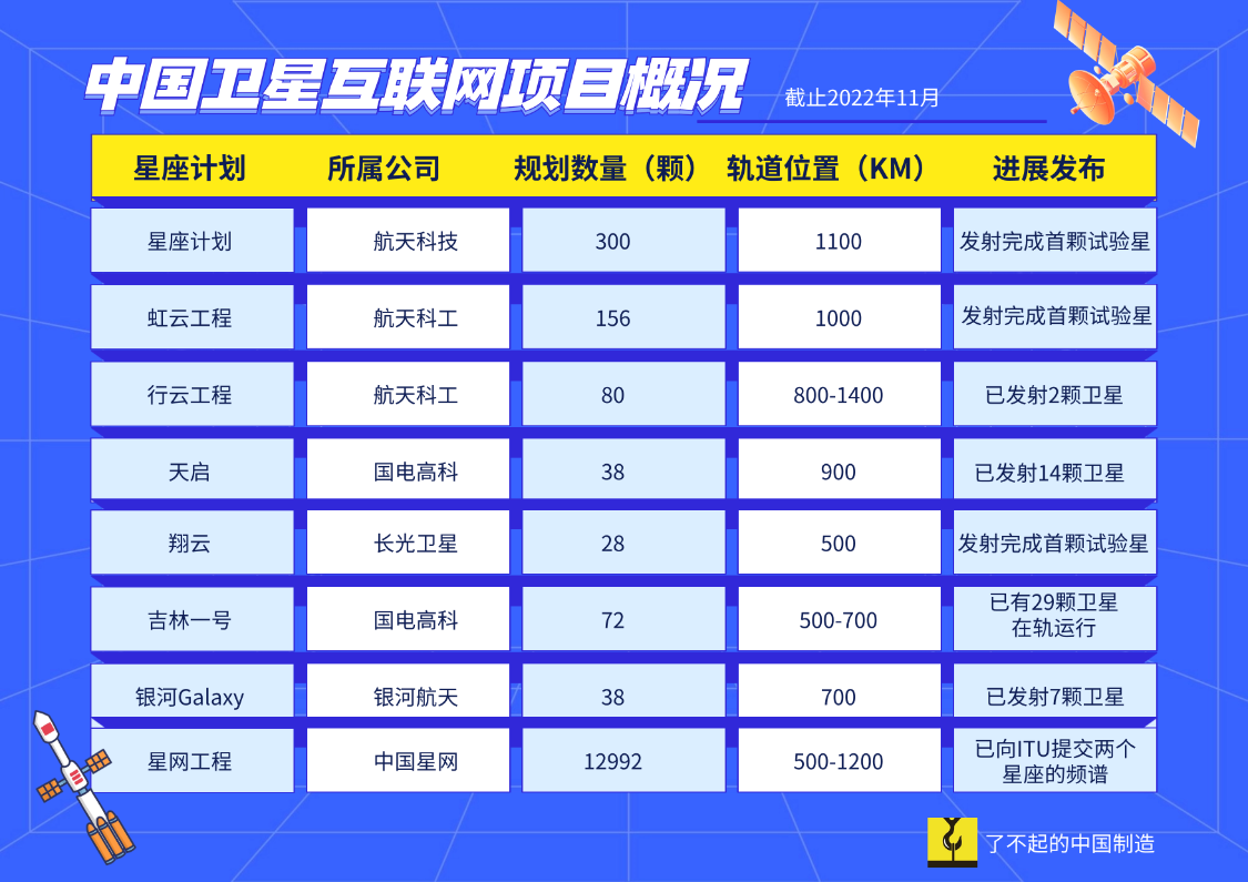 “虹云工程”是由中国航天科工集团有限公司牵头研制的隐蔽全球的低轨宽带通讯卫星系统,策动用156颗小卫星组成卫星互联网系统,“鸿雁星座”是由中国航天科技集团自主成立的低轨卫星通讯系统,策动用60颗中枢主干卫星和数百颗宽带通讯卫星组成系统,齐全全球无死角的目田接入宽带互联网。